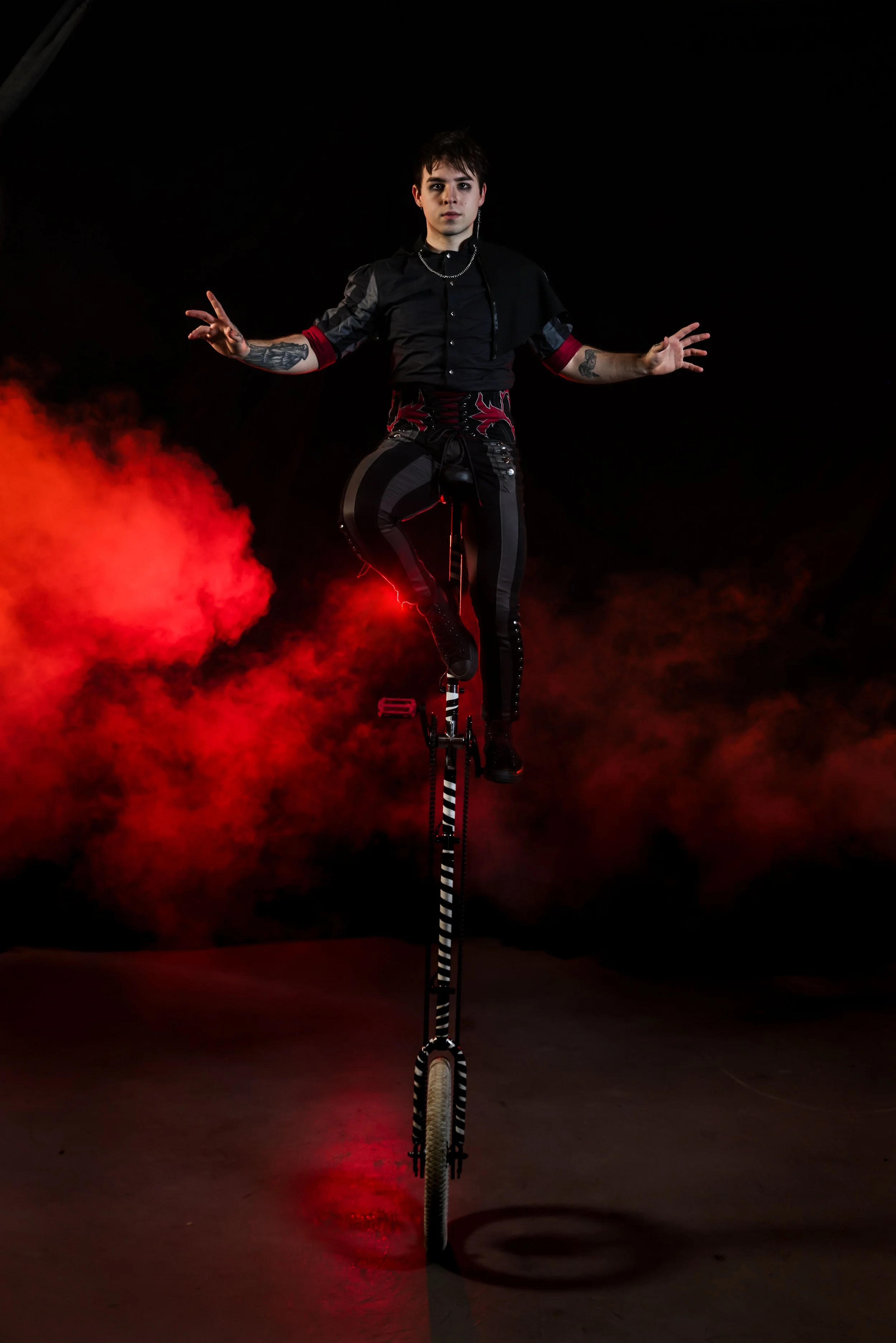 A multidisciplinary performance artist, Harlequin presents his classic speed juggling and giraffe unicycle acts with a dark yet whimsical flare, inspired by early 20th century aesthetics and nostalgia for times that never were. He’s been performing in variety, cabaret, and various circus productions since getting his start working beneath a former Cirque du Soleil clown.